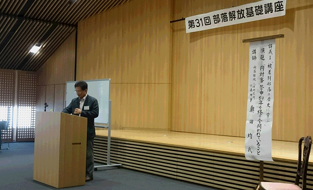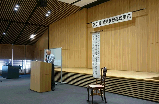 続いて、大阪市立大学非常勤講師の谷本 昭信氏による「部落差別の現状と部落問題克服への課題」の講義があり、日本の人権状況と部落差別の現状、そして部落問題克服に向けた展望と課題を語られました。