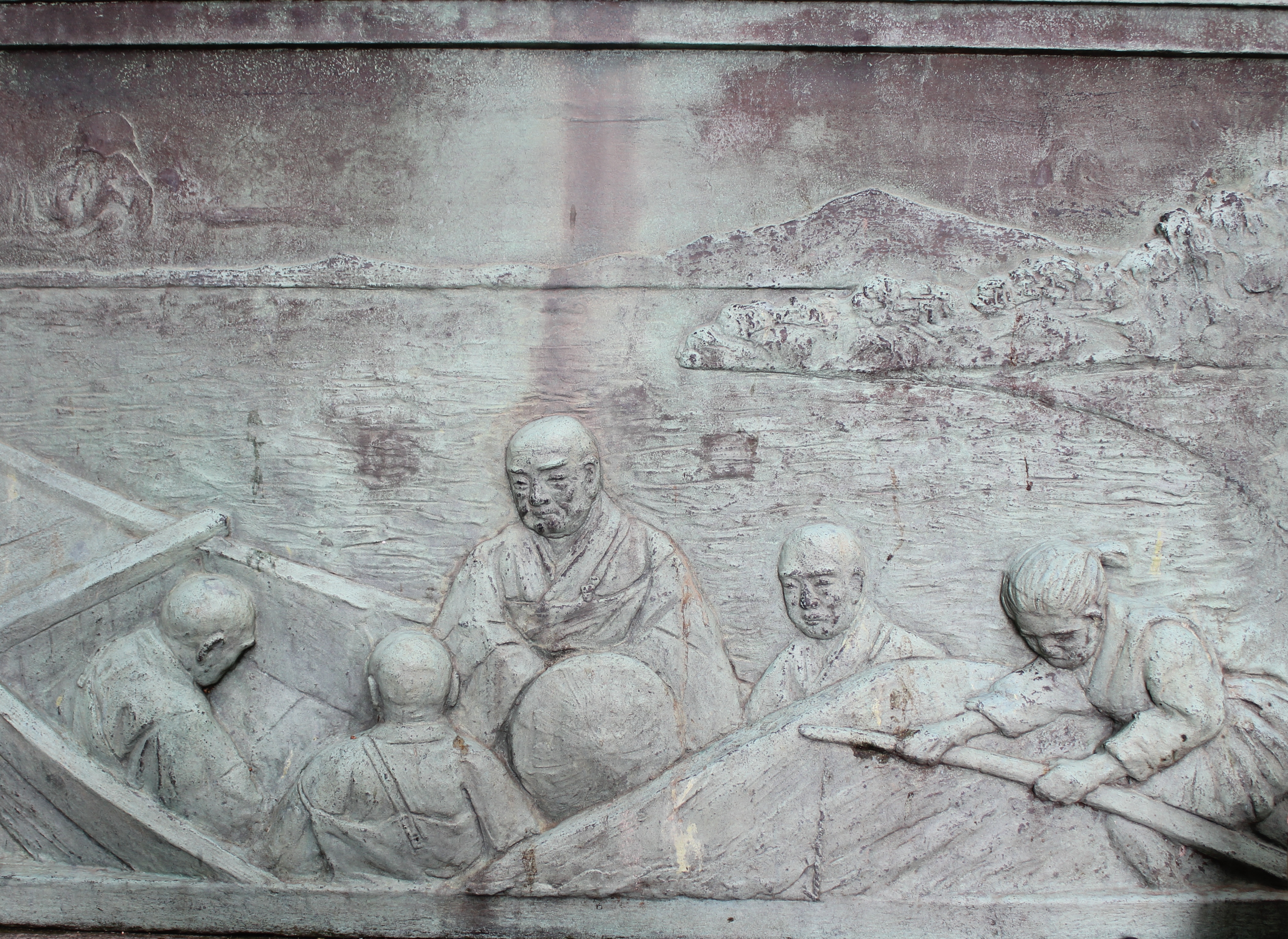 「文明三年(一四七一年)七月五十七才北国の教化を志ざし福井県の吉崎にお寺を建て、二十三年のうちに越前の国守の帰依を初め加賀能登はもちろん、奥州の遠方にまでご教化がのびて、真宗中興の偉業を成しとげられた。文明七年七月国守朝倉敏景公の勅請によって、前年焼失した御坊の本建築用材募集のため、家老下間安芸の法眼蓮崇を越前大野に使わしたが、城主朝倉恒景と争いを生じ、真宗の繁栄を憎んでいた平泉寺の宗徒らが合流し吉崎の御坊を急襲してきた。上人は、同年八月二十二日夜ひそかに瀬越の亭の小舟で塩屋の浦から橋立の芳成坊の道場に避難された。その後、小塩の信者小鍛冶屋五郎衛門の舟で、同氏が船頭で橋立の矢師九郎三郎らが乗り組み、慶聞坊など二十三の弟子を伴い、北陸五ヶ年の教化に名残を惜しまれこの小塩の浦から若狭の小浜へ行かれた。ときに上人五十七才。今を去る四百八十年の昔であった。」