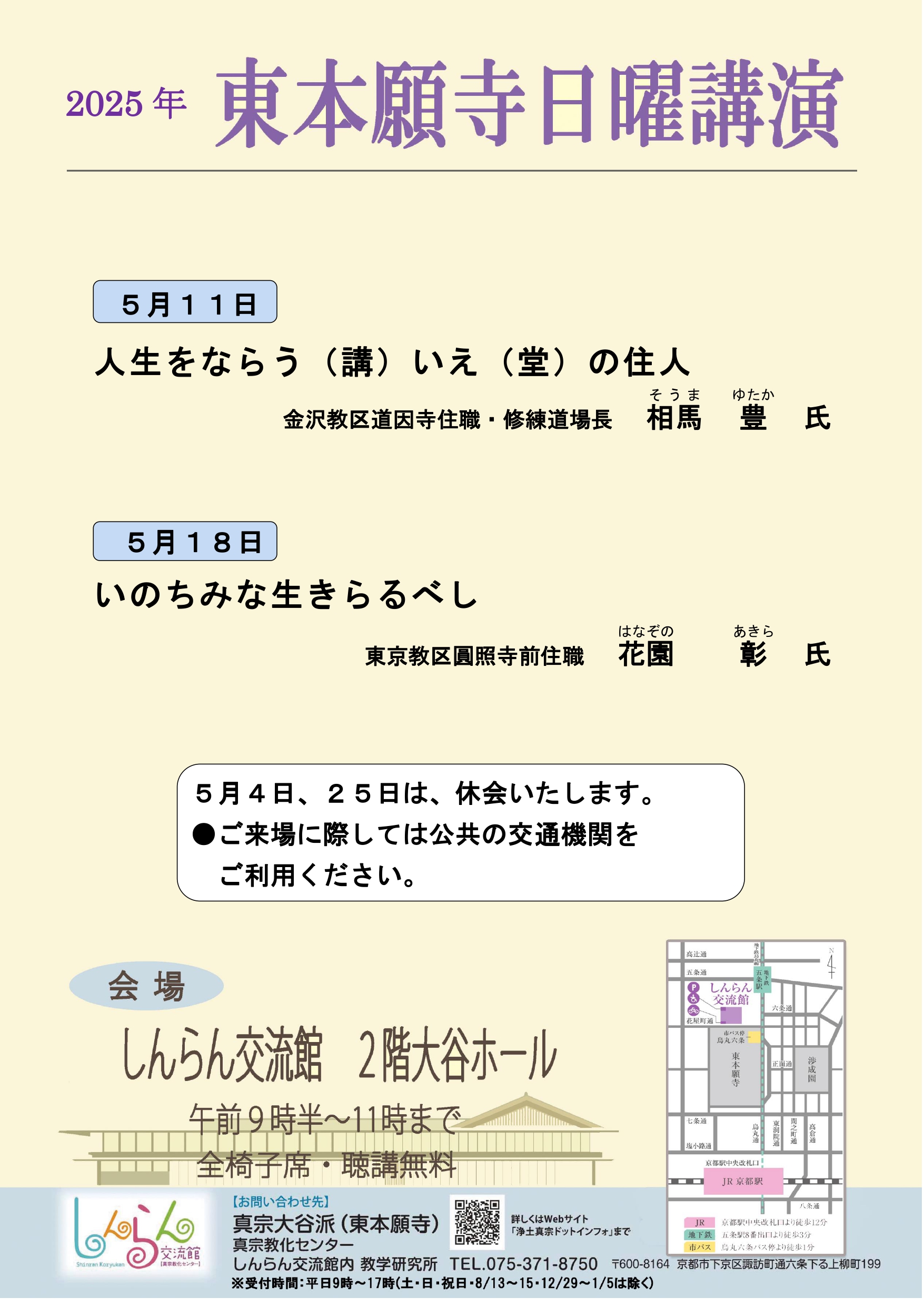 2025年5月東本願寺日曜講演 2025年5月東本願寺日曜講演 2025年4月18日 教学研究所 2025年5月東本願寺日曜講演2025-04-18T12:12:46+09:00 日曜講演, 教学研究所, 参加する, 教えにふれる, 交流館行事案内 Tweet 親鸞聖人の教えから人生の課題をいただき、日々、歩まれている方々の講演会を開催します。 聴講無料。どなたでもご聴講していただけます。 ♦ 5月11日 人生をならう(講)いえ(堂)の住人 相馬 豊 氏(金沢教区道因寺住職・修練道場長) 5月18日 いのちみな生きらるべし 花園 彰 氏(東京教区圓照寺前住職) ♦時 間 9:30~11:00 ♦会 場 しんらん交流館2階 大谷ホール ※ご来場に際しては公共の交通機関をご利用ください。 来月の予定 期 日役 職講 師講 題6月22日九州大谷短期大学副学長・京都教区明覺寺住職武井 弥弘 氏供養と諸仏 東本願寺日曜講演