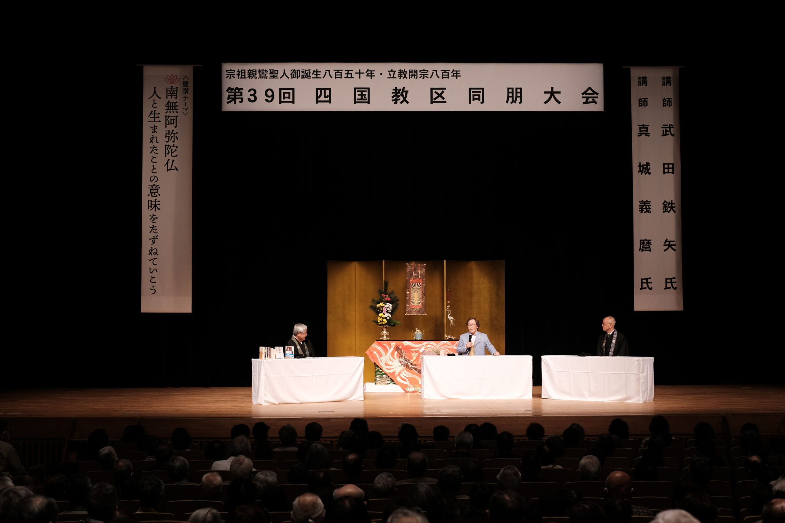 その後、趣旨説明に続き講演が行われました。久保博巳氏(東讃第1組深妙寺)司会のもと、講師の武田鉄矢氏(歌手、俳優)と真城義麿氏(東予組善照寺)には「南無阿弥陀仏〜人と生まれたことの意味をたずねていこう〜」をテーマに対談いただきました。