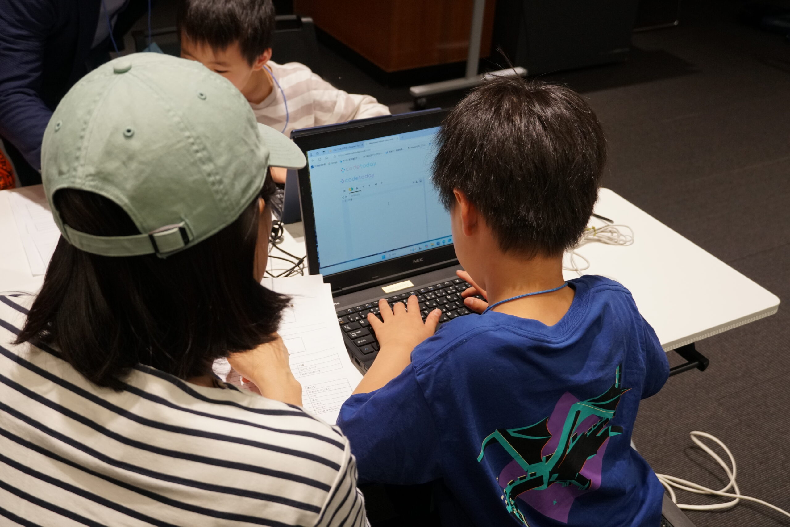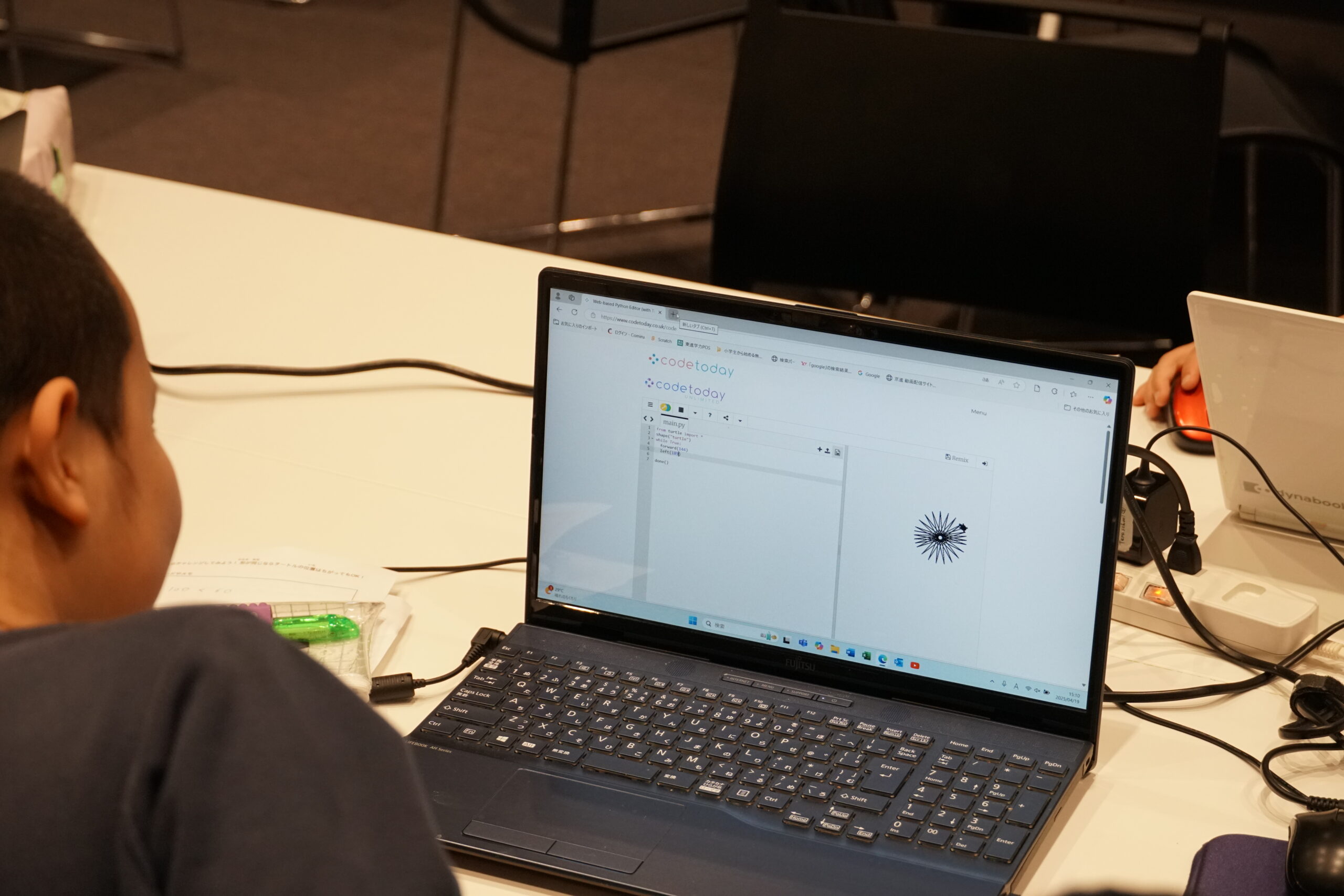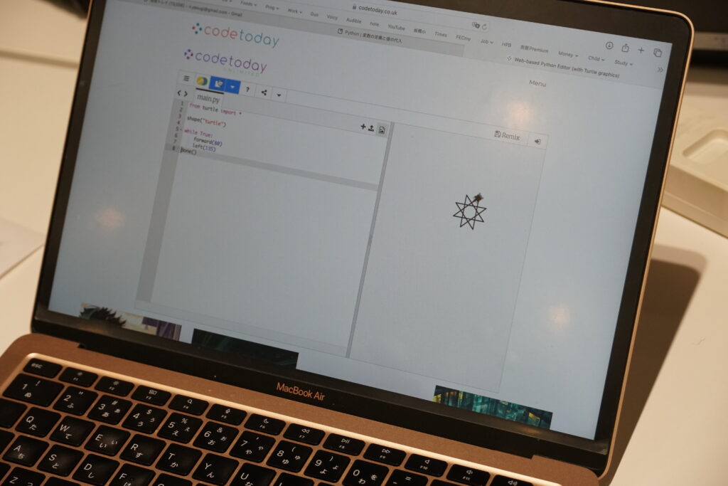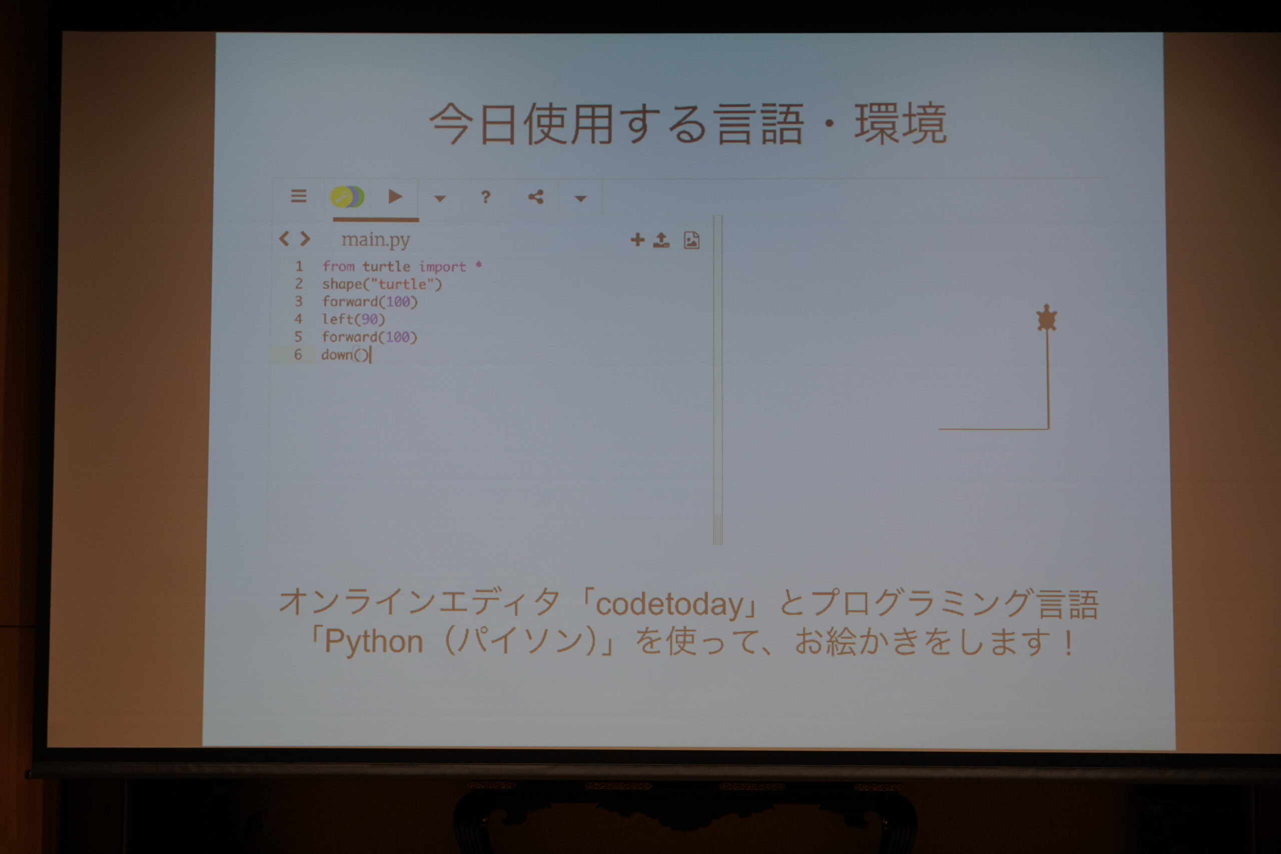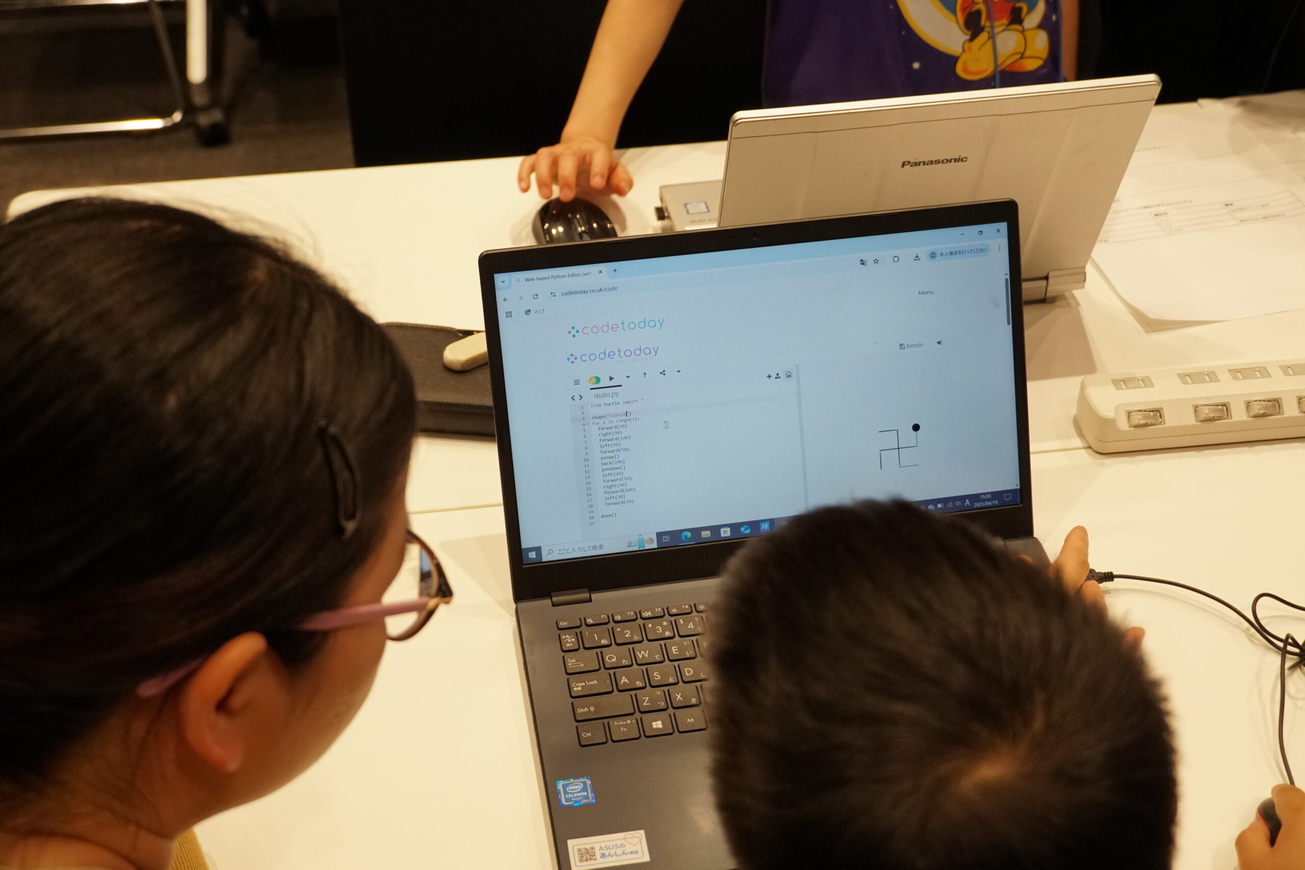 今回のワークショップは「codetodey」というオンラインエディタ上で「Python(パイソン)」というプログラミング言語を用いて、お絵かきをしてみようという内容でした。参加者は22名と、たくさんの親子が参加してくれました。