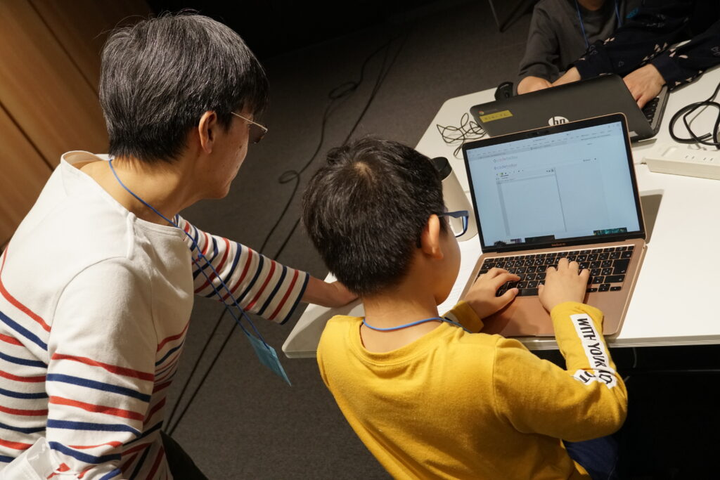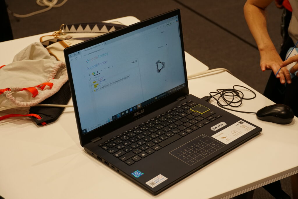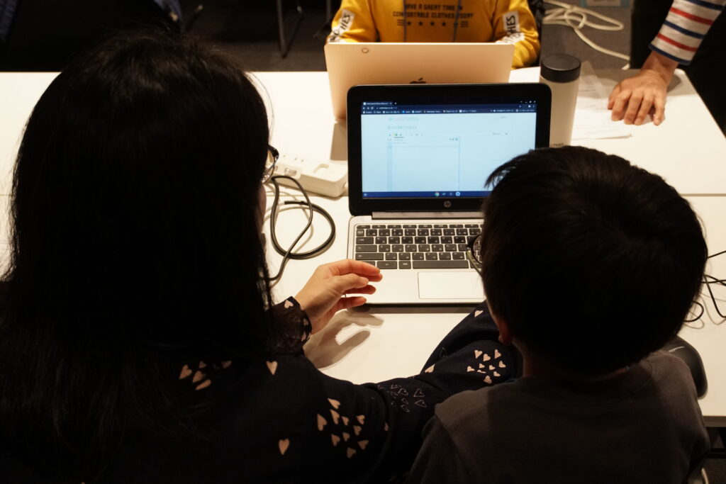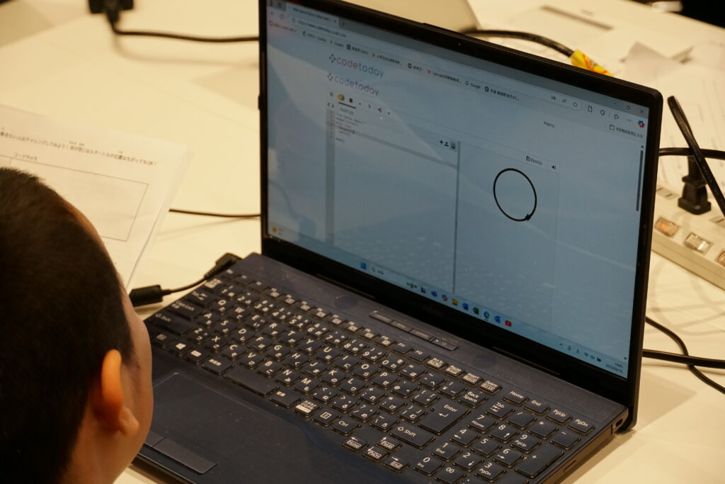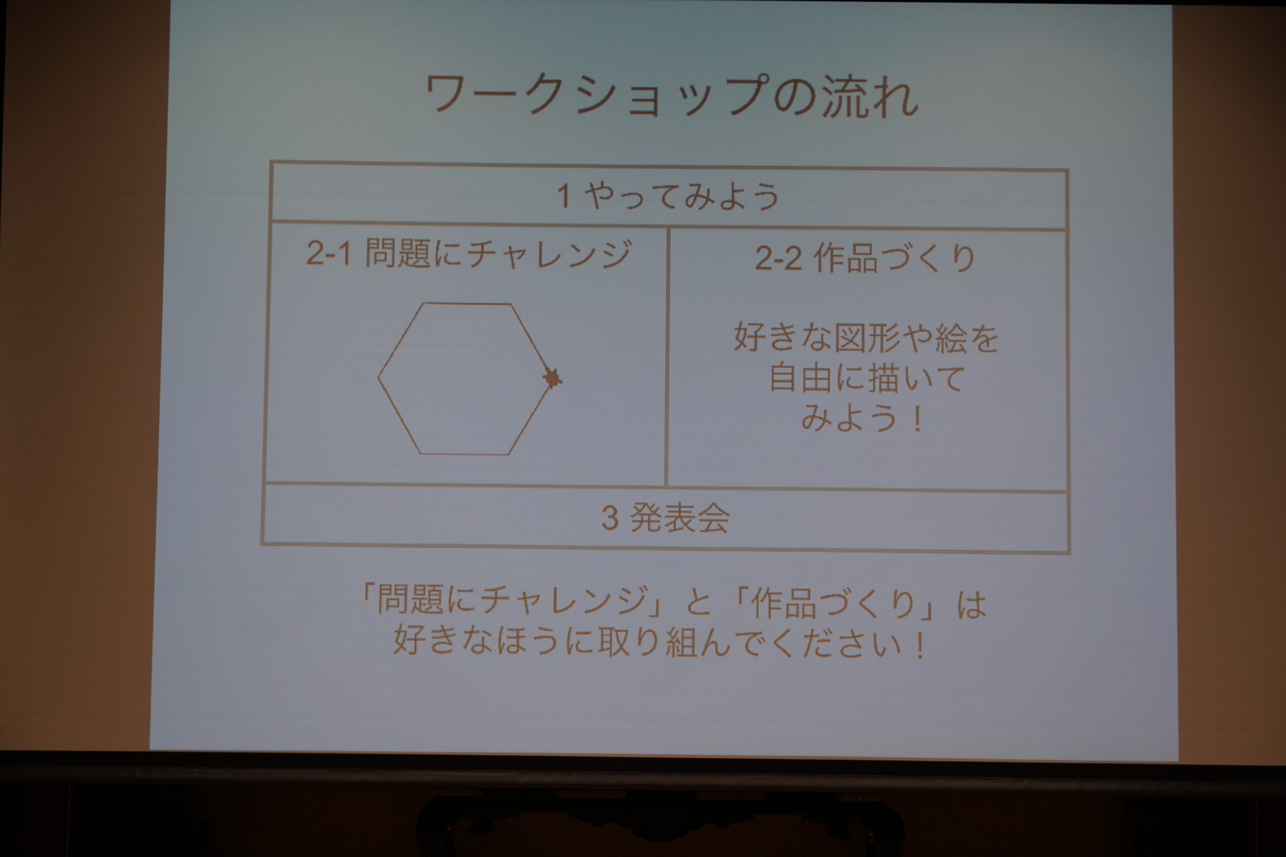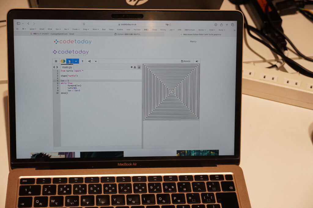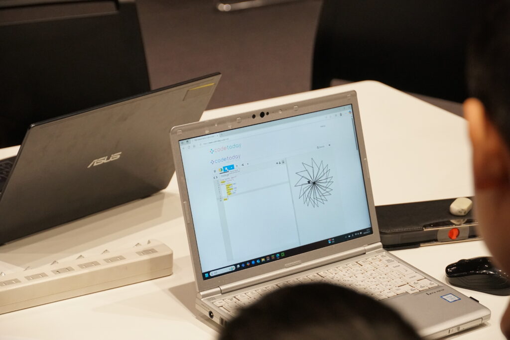 今回のワークショップは「codetodey」というオンラインエディタ上で「Python(パイソン)」というプログラミング言語を用いて、お絵かきをしてみようという内容でした。参加者は22名と、たくさんの親子が参加してくれました。