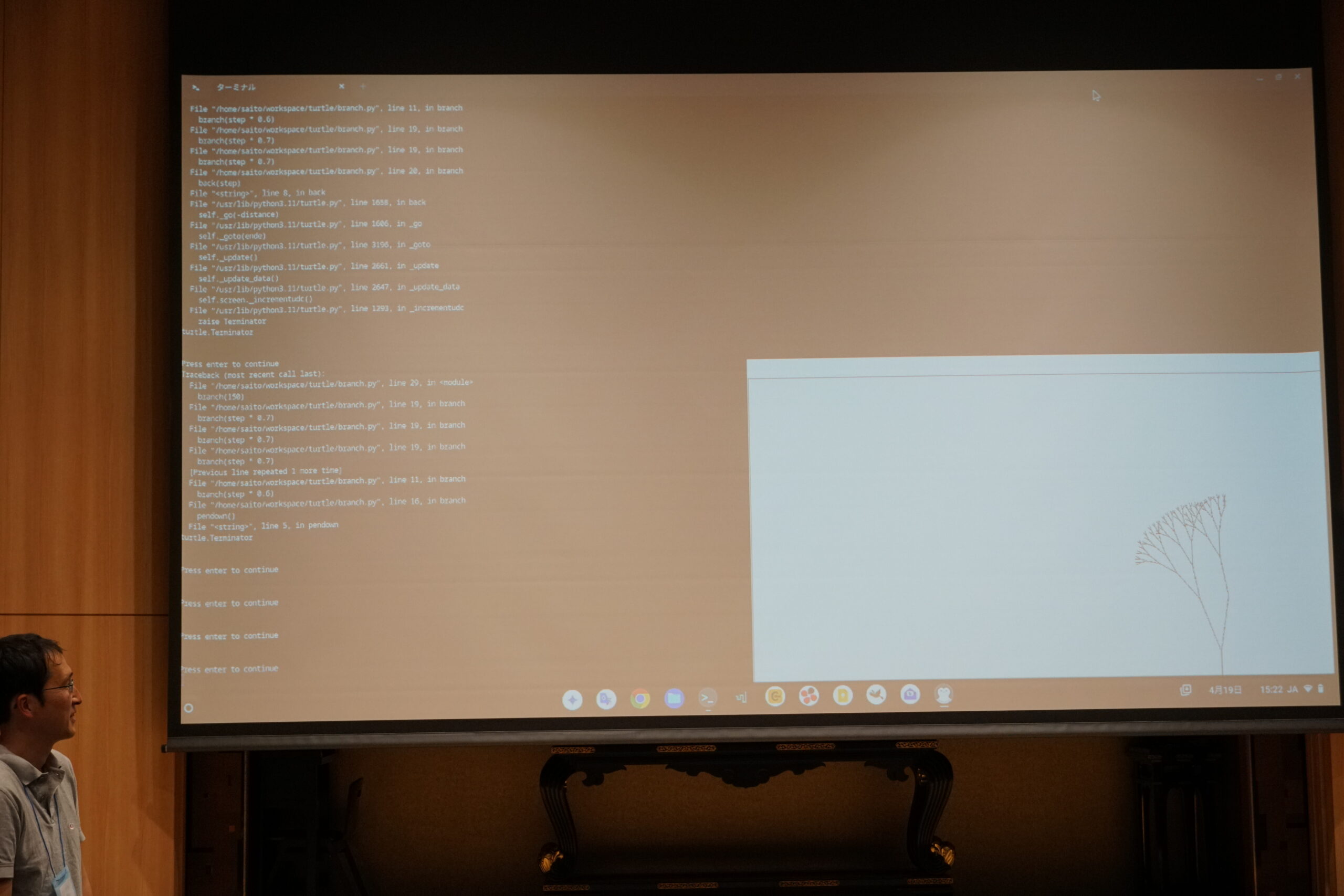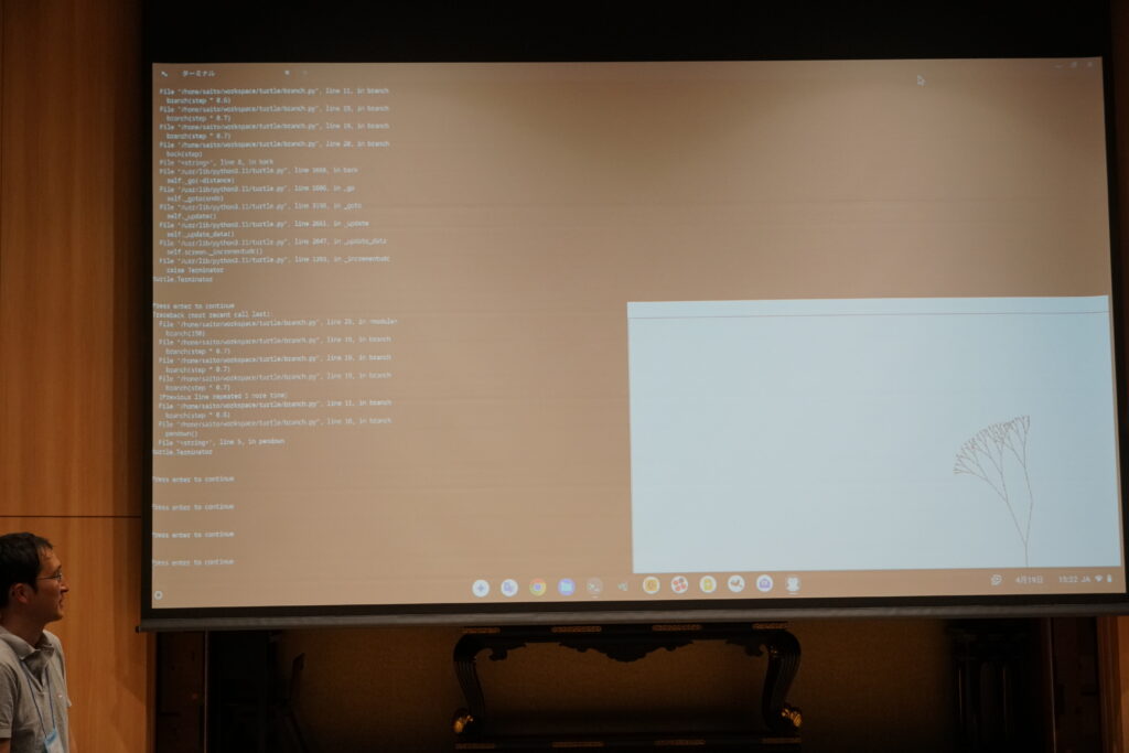 ワークショップ終了直前には、講師からより複雑なプログラミングによる樹形図の描き方の発表もありました。