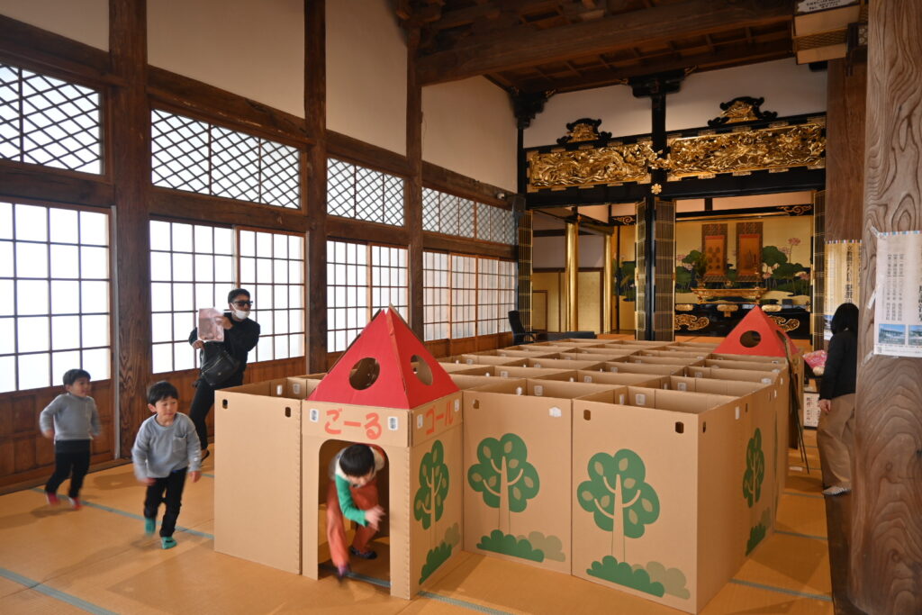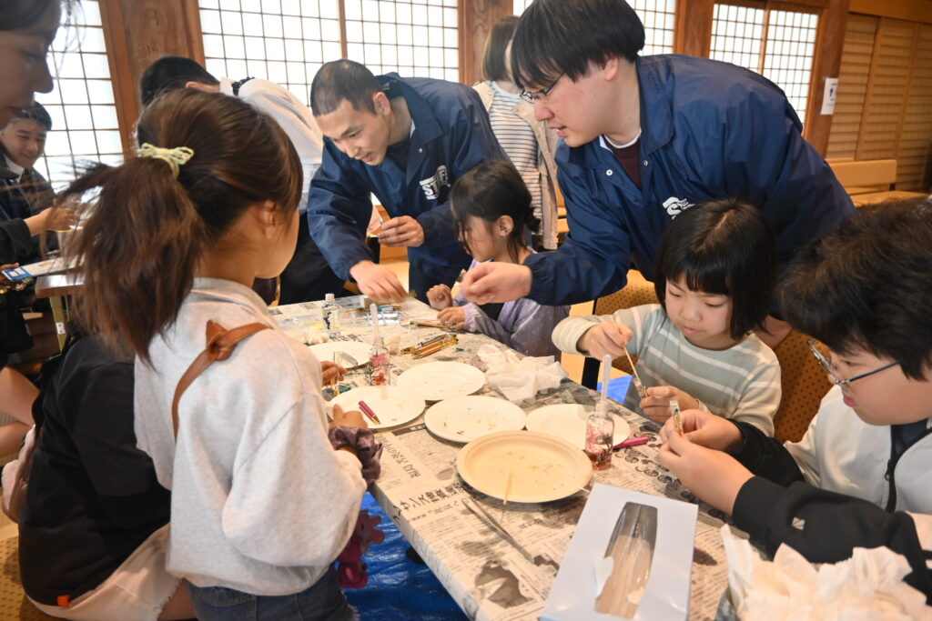 東別院内の念珠づくり、段ボール迷路、坊主カフェや昔遊びは以前から大人気のコーナーです。来られた方にお話を伺うと、「子どもに教えてもらって初めて別院に来ました。広い場所でたくさん遊べるイベントがあっていいですね」という声や、毎年家族と一緒に来ているという方からは、「以前スタッフとして関わっていたので、どんな催しをやっているのか気になります」という感想が聞かれました。本堂、境内は子どもたちの活気に溢れ、両別院を行き来するたくさんの人の姿がとても印象的な一日でした。