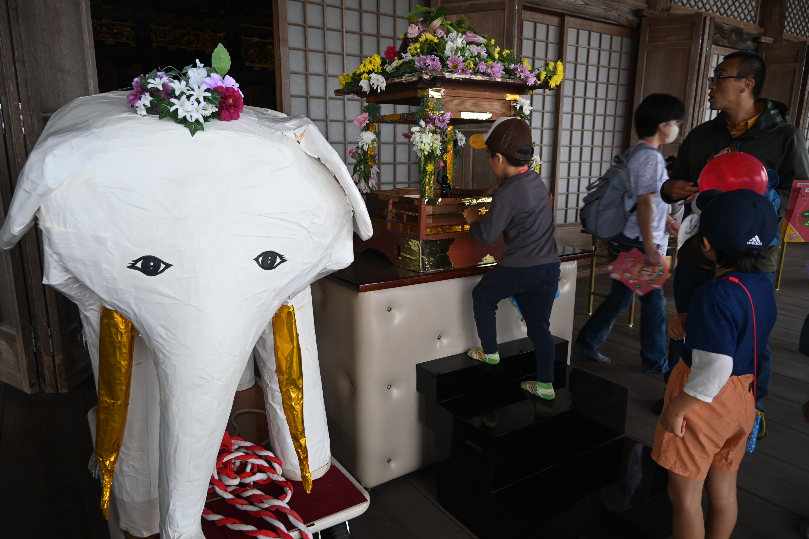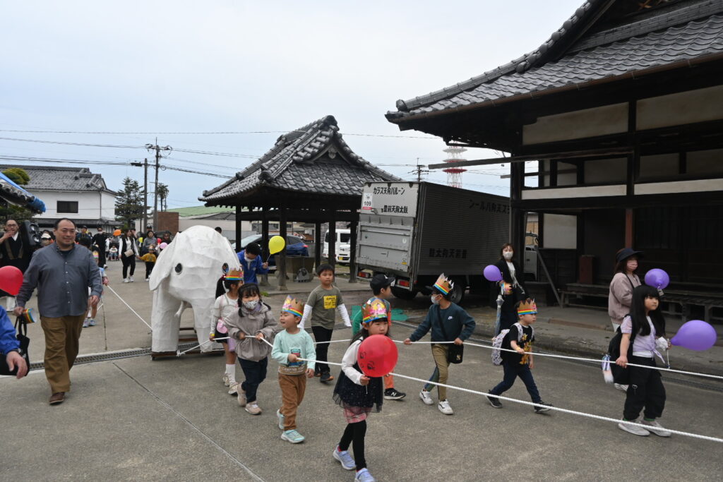 当日は、東別院の本堂で直参門徒による紙芝居「ごんぎつね」の読み聞かせの後、西別院へ向けてパレードが行われました。冠をかぶった子どもたちが白象をひきながら四日市の町を練り歩きます。