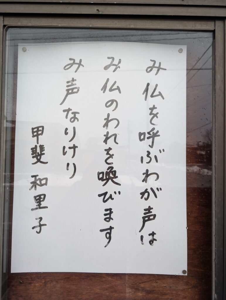 雪が降る中、榮恩寺に取材に伺った。榮恩寺の掲示板は、道に面する鐘楼門にある。蓮如上人五百回御遠忌法要にあわせた本堂の改修の際、寺の世話人の方が製作され、それ以来、月に一度は掲示板に載せる言葉を更新するようにしているそうだ。
