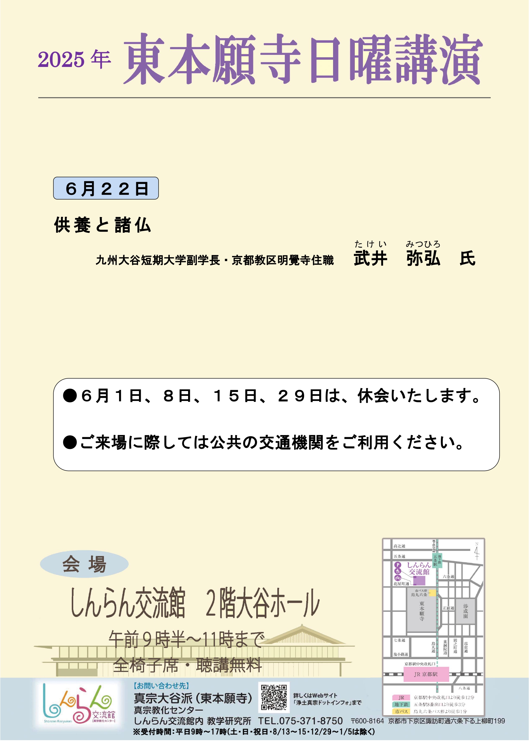 2025年6月東本願寺日曜講演 2025年6月東本願寺日曜講演 2025年5月15日 教学研究所 2025年6月東本願寺日曜講演2025-05-15T09:38:12+09:00 日曜講演, 教学研究所, 参加する, 教えにふれる, 交流館行事案内 Tweet 親鸞聖人の教えから人生の課題をいただき、日々、歩まれている方々の講演会を開催します。 聴講無料。どなたでもご聴講していただけます。 ♦ 6月22日 供養と諸仏 武井 弥弘 氏(九州大谷短期大学副学長・京都教区明覺寺住職) ♦時 間 9:30~11:00 ♦会 場 しんらん交流館2階 大谷ホール ※ご来場に際しては公共の交通機関をご利用ください。 来月の予定 期 日役 職講 師講 題7月27日大谷大学教授東舘 紹見 氏「弥陀如来の化現」としての宗祖親鸞聖人 東本願寺日曜講演