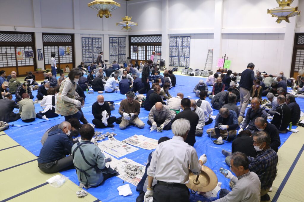 当日は総勢125名が6班(15名~26名)に分かれて円を作り、仏具に磨き粉を全体に塗る係→タオルで仏具を磨く係→新聞紙で仏具を磨き仕上げる係…といった具合に仏具をリレーしていく【ぶつぐリレー】方式で作業が行われました。