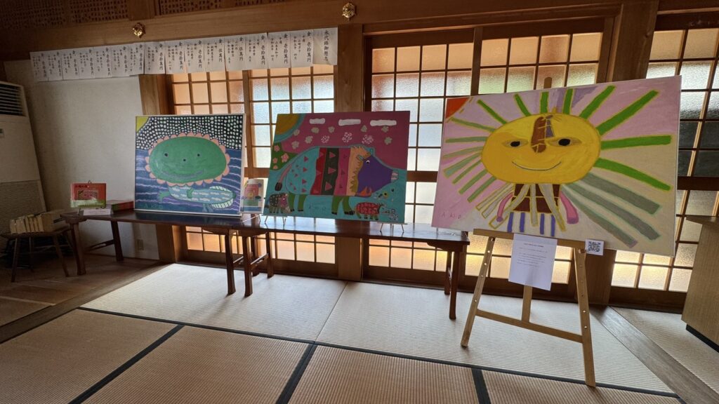 本堂に上がると、つちや氏の原画が3点展示されており、原画の大きさと独特な色彩に驚かされます。また、お寺でアートを眺めるのも新鮮な気持ちでした。資本主義的な芸術ではなく、現代社会の価値基準、判断基準にとらわれないアートを発表していく場にはお寺がふさわしいのではないかと摂受氏は語られていました。今回の展示により、お参りに来られた方の中には、孫へと絵本を求める方もあれば、読み聞かせをしている方が求めていかれたりもしたとのことです。そういう、お寺に置いたからこそ起きた出遭いを大切にしていきたいとも考えているようです。
