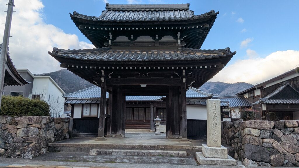 滋賀県にある琵琶湖の北西に位置し、水運で栄えたマキノ町海津の街道沿いに二重門の山門が立つ。その門の脇に掲げられている、しなやかな毛筆で書かれた法語が目を引く。法語を考え、筆を執るのは一英住職。その都度御教えに出遇い、日々のあり方を見つめ、心がひらかれるという。