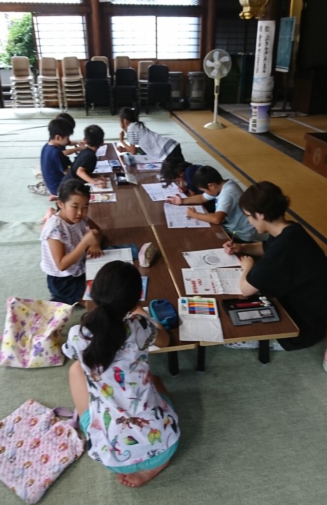その後、子どもたちの「もっとお寺で遊びたい」の声をきっかけに「カブちゃん寺子屋」という宿題を持ち寄る会を開かれました。お昼頃に再びお寺に集まり、皆で宿題をやる。終わった子から好きに遊んでよい。毎年、およそ12~3人の子どもたちが期間中毎日集まるそうです。
