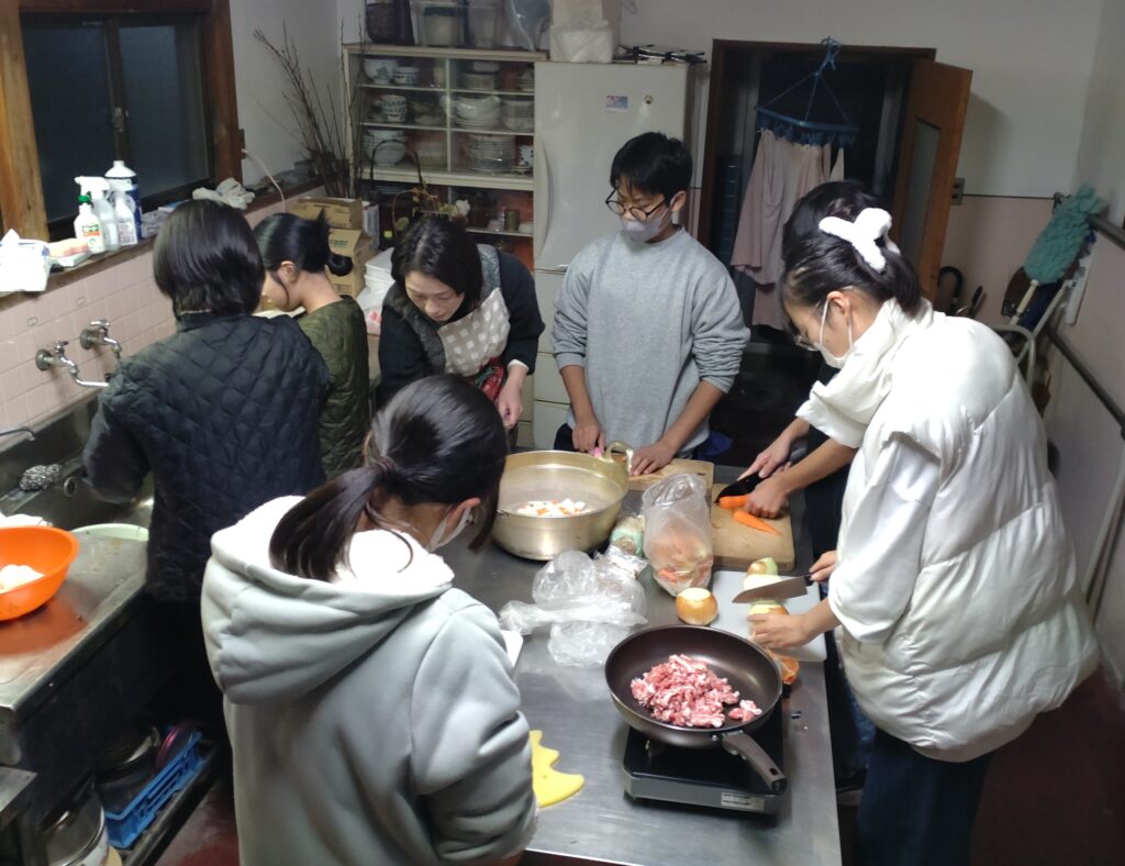 これらの行事では、子ども会のOBである「若者同朋会」の中学生から社会人までのメンバーが、行事の手伝いをしてくれます。行事では準備や片付けはもちろん、調理や進行の手伝いも若者同朋会の皆の手に任されています。また、出店などもメンバーの発案で行われます。住職は予算を決めるだけで、店の種類やどのような準備が必要か、全てメンバー主導で、タコ焼きやフルーツポンチやスイーツなど、その時々の子どもに喜んでもらえるものをそれぞれの工夫で作られています。年の終わりには、除夜の鐘を突きに来てくれる人のために豚汁を皆で用意します。鐘を突いた後も皆で本堂に残って語り合い、そのまま修正会を勤めます。