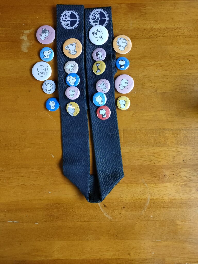 また、普段からご法事に行く際には輪袈裟にオリジナルの缶バッジを付けて行かれ、子どもがいるお家では1つずつ配っておられます。「子どもにとって法事の思い出として、一つでも嬉しいことが増えるといいな」と始められ、今では年に5~60個配るほどになり、お寺に親しむきっかけの1つとして続けておられます。