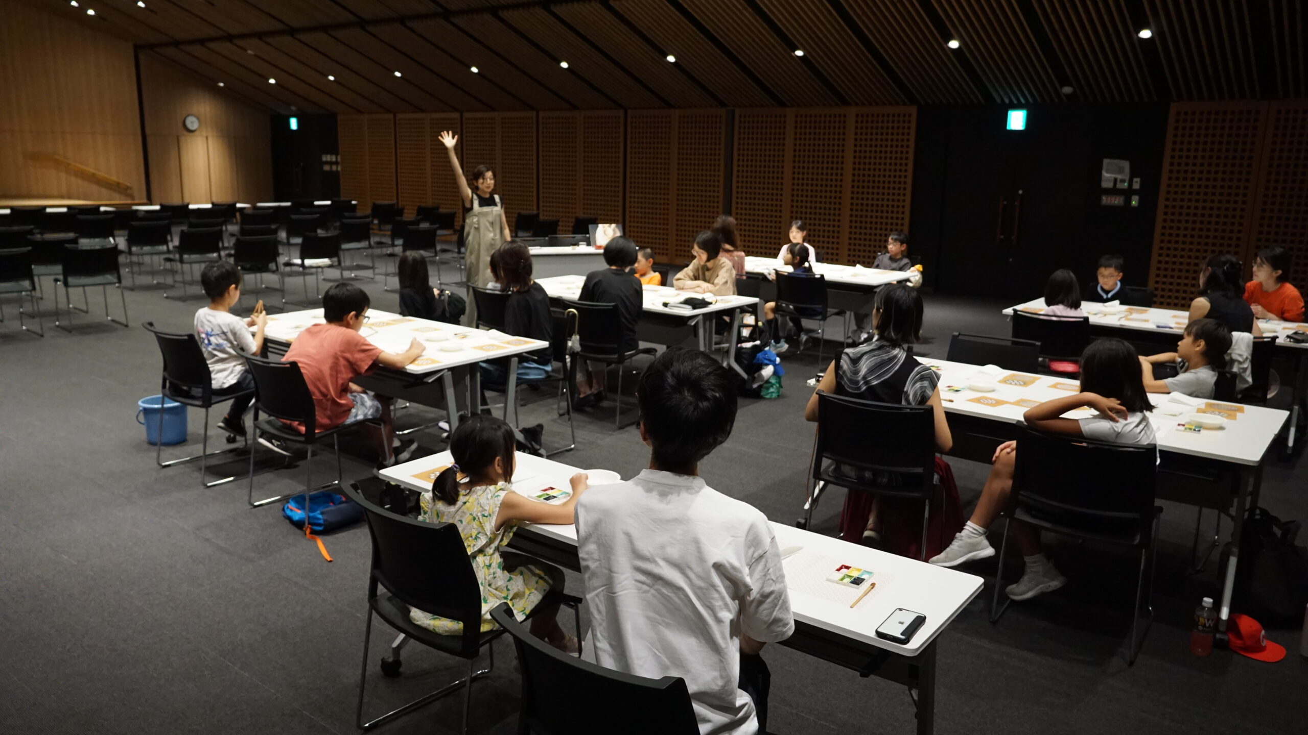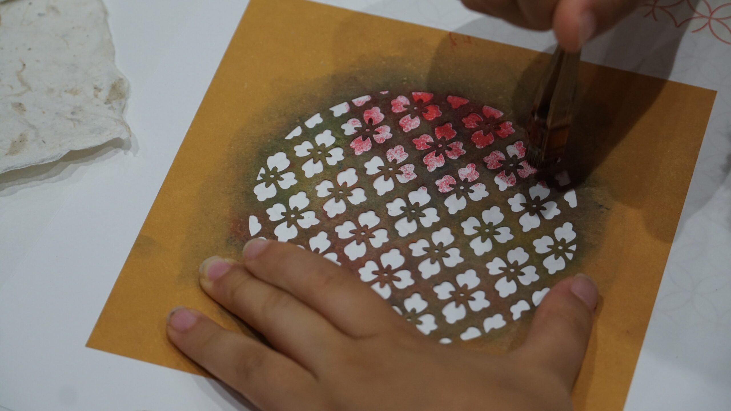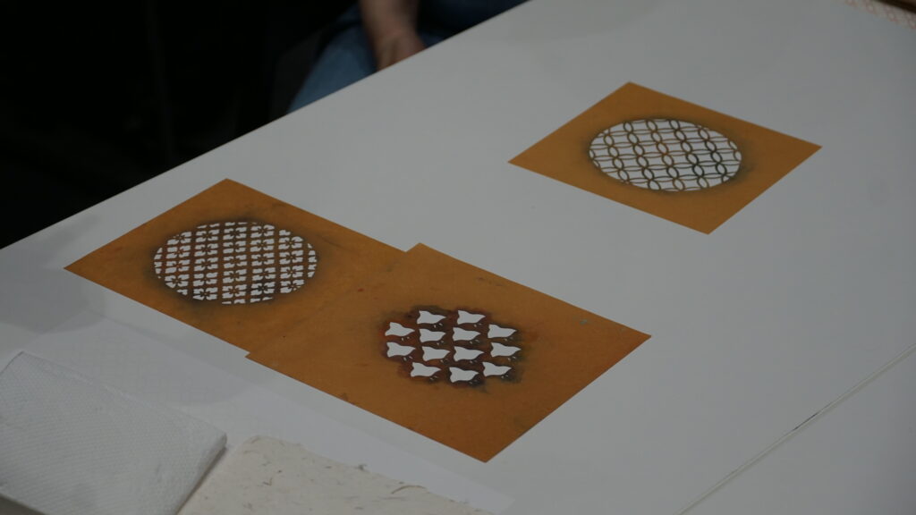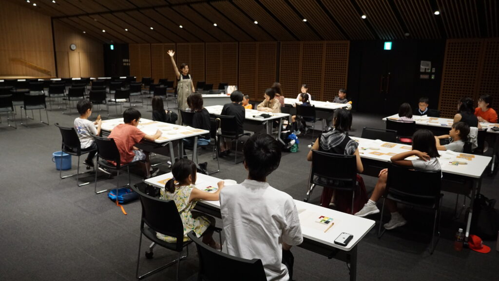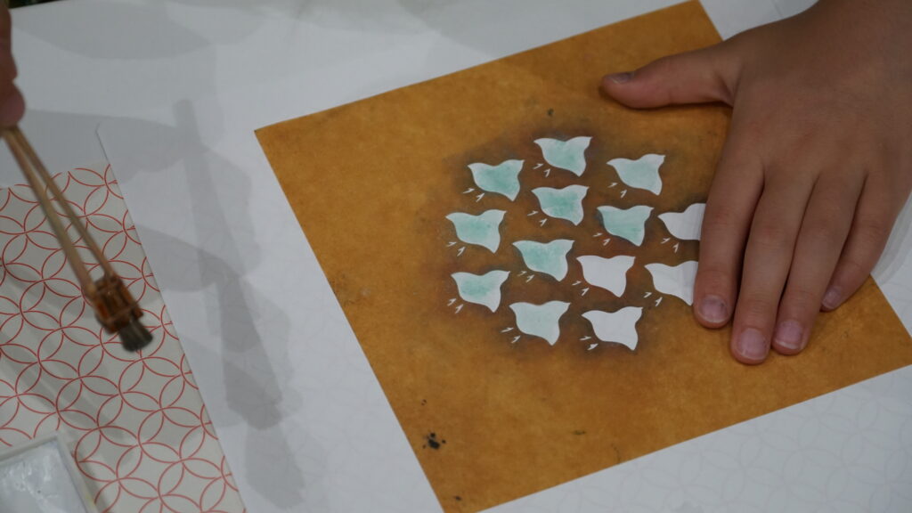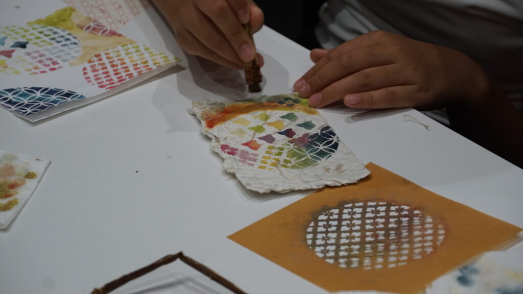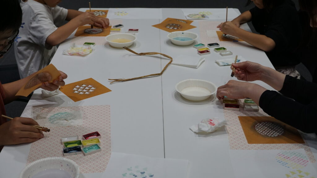 今回のワークショップは着物の柄や文様の染に使われ、1000年以上の歴史を持つ「伊勢型紙」と日本の染職人が実際に使っている道具を用いてオリジナル和紙はがきをつくろうという内容でした。参加者は21名と、たくさんの親子が参加してくれました。