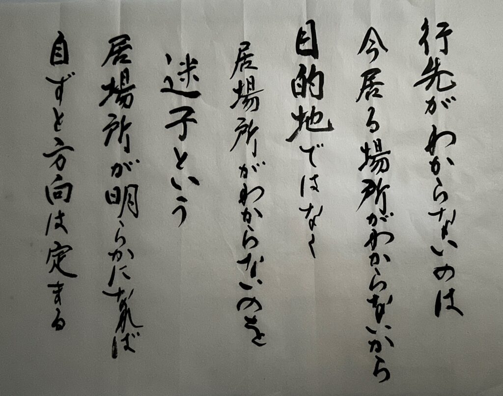 私たちは豊かな生活の中で、自身の居場所を見失い迷子になっているのではないでしょうか。居場所が明らかになれば自ずと方向が定まる。私は今、どこにいるのか。そのことを気づかせてくれるのが仏教なのではないでしょうか。