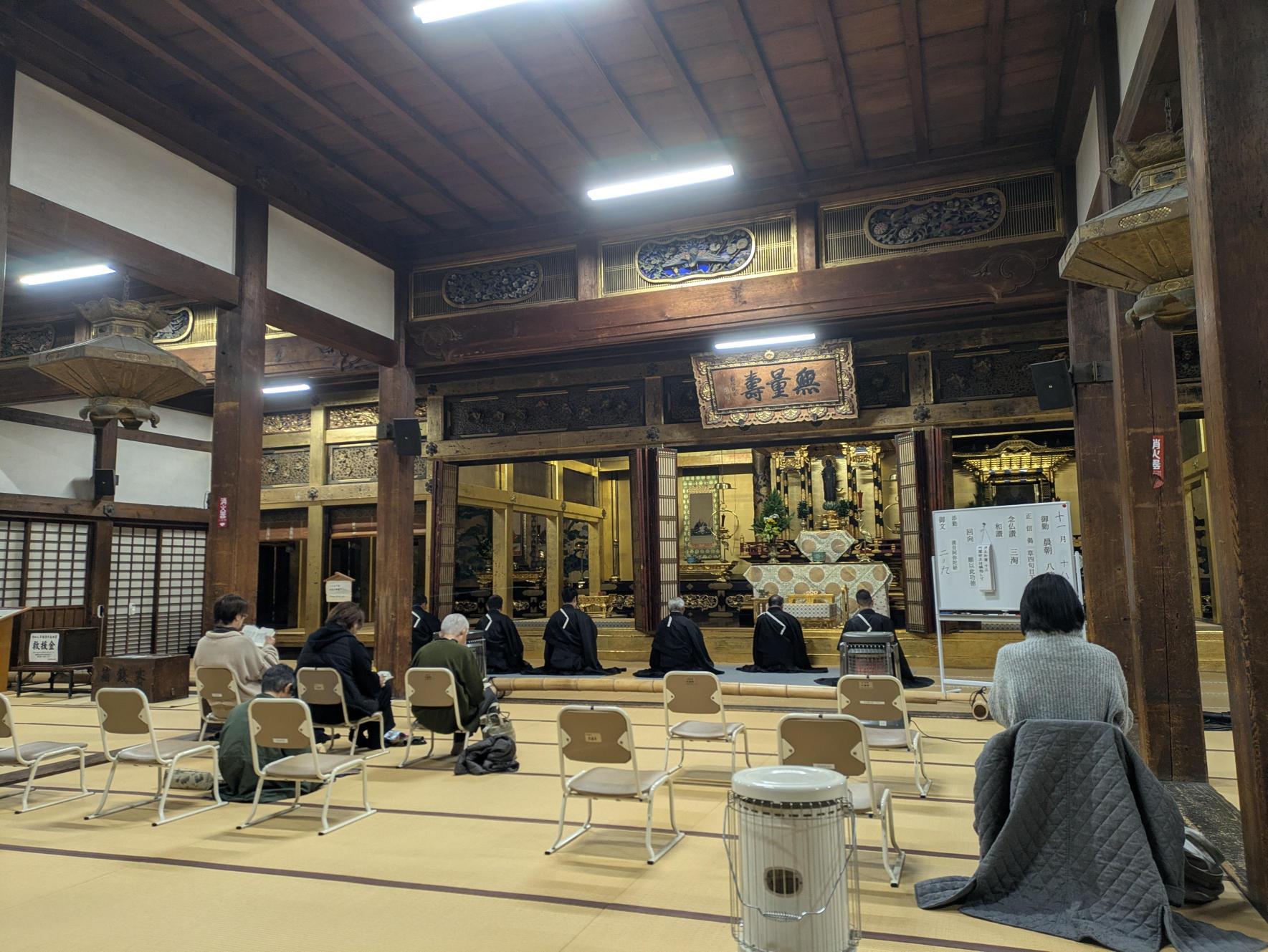 就任されてからの曽我輪番は、「みんなと一緒にすること」を大切にされているという。例えば、晨朝の次第をホワイトボードに掲示し、参拝者と一緒に勤行できるようにと同朋唱和にされた。参拝者もその思いを受けて各々声明集を準備している。付箋を貼ったりペンで行を追いながら勤行され、テンポの速い勤行に遅れずに声を出されていた。参拝者の数も少しずつ増えているそうである。また、報恩講の音楽法要でも、儀式中の三帰依文をパーリ語にし、導師の独唱に続いて参拝者が復唱する同朋唱和の形にされている。