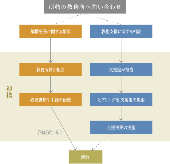 • 解散に至るまでの教化事業の支援です。解散合併に係る事務手続きについては、教務所で対応します。